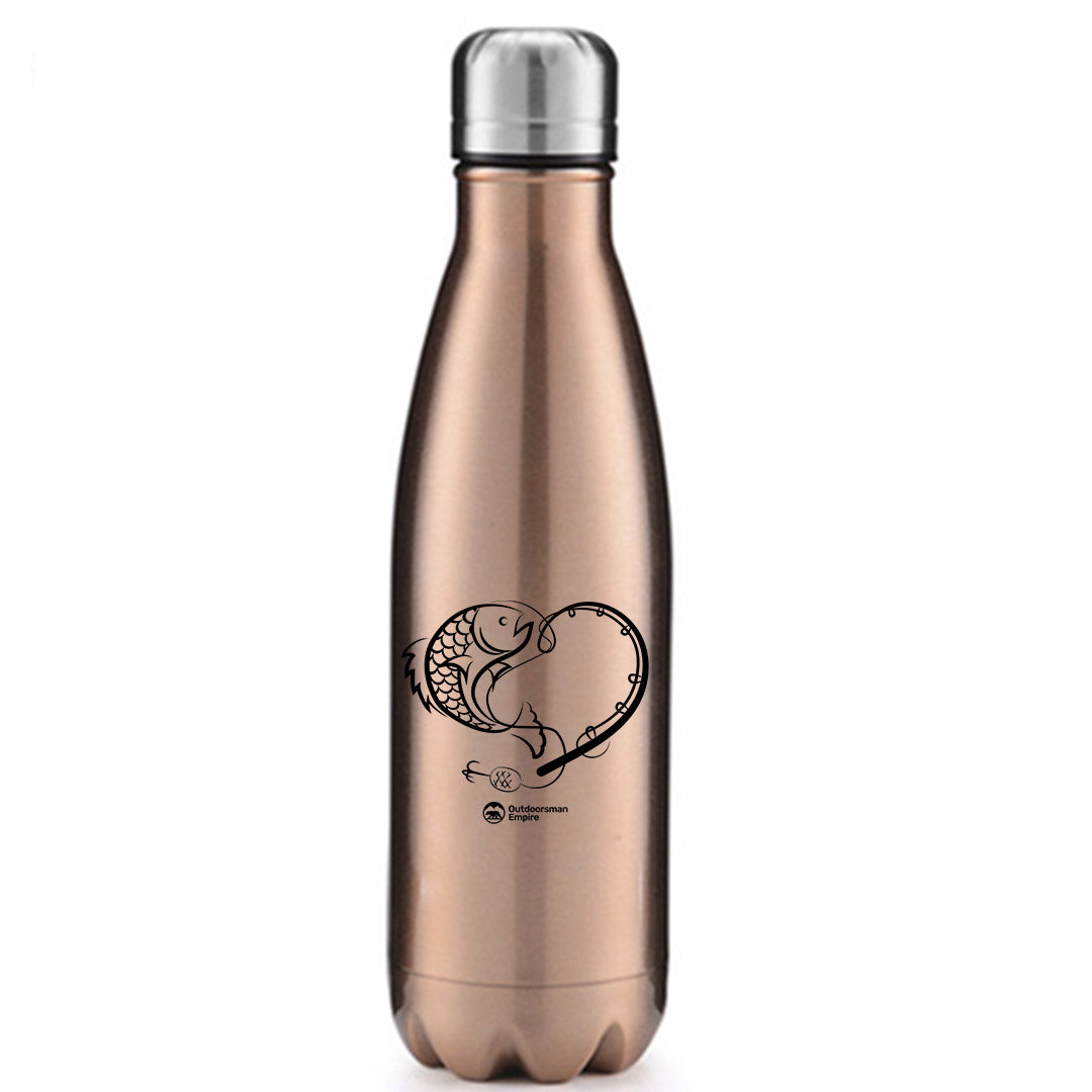 Fishing Heart Stainless Steel Water Bottle with double-walled insulation and UV printed design, perfect for outdoor activities.