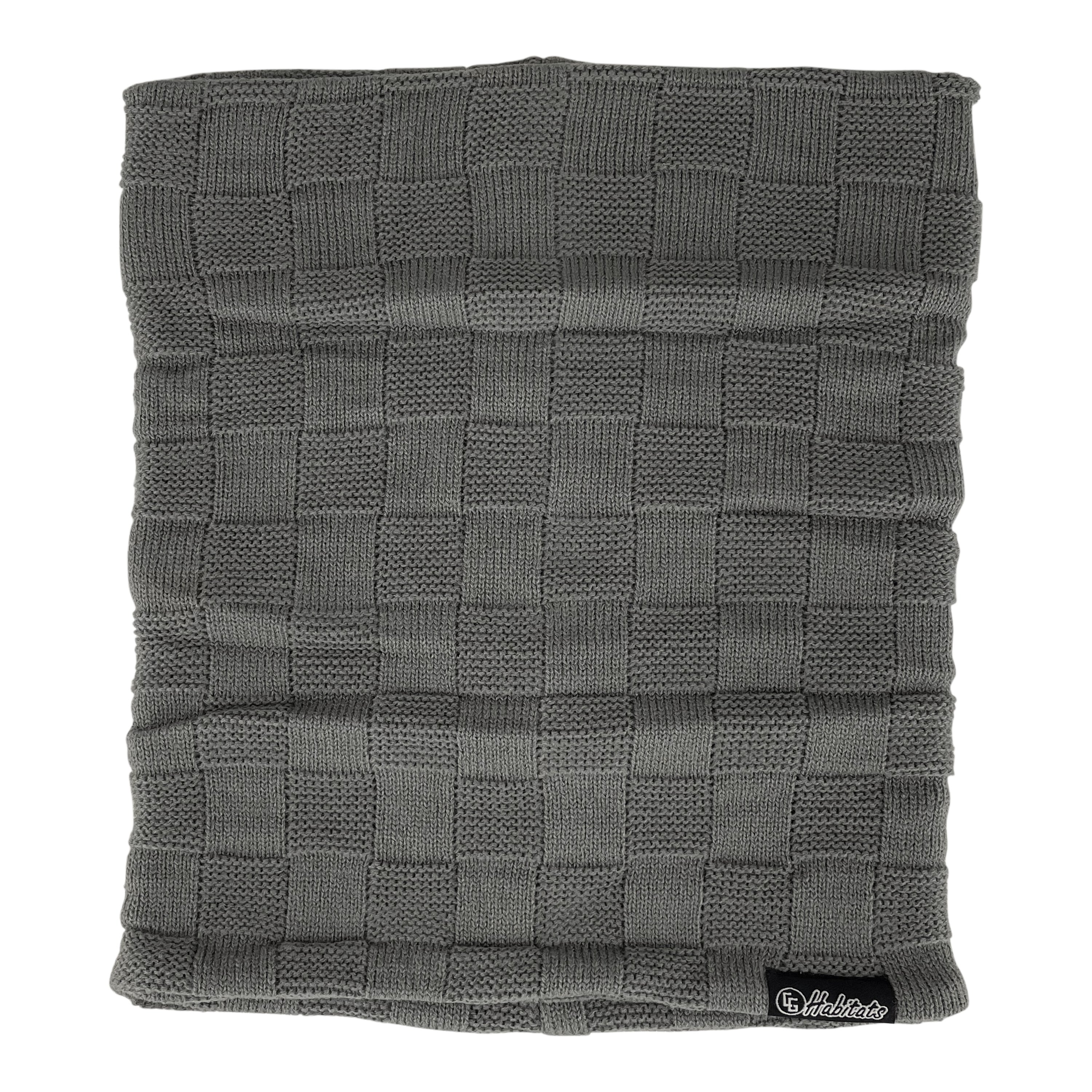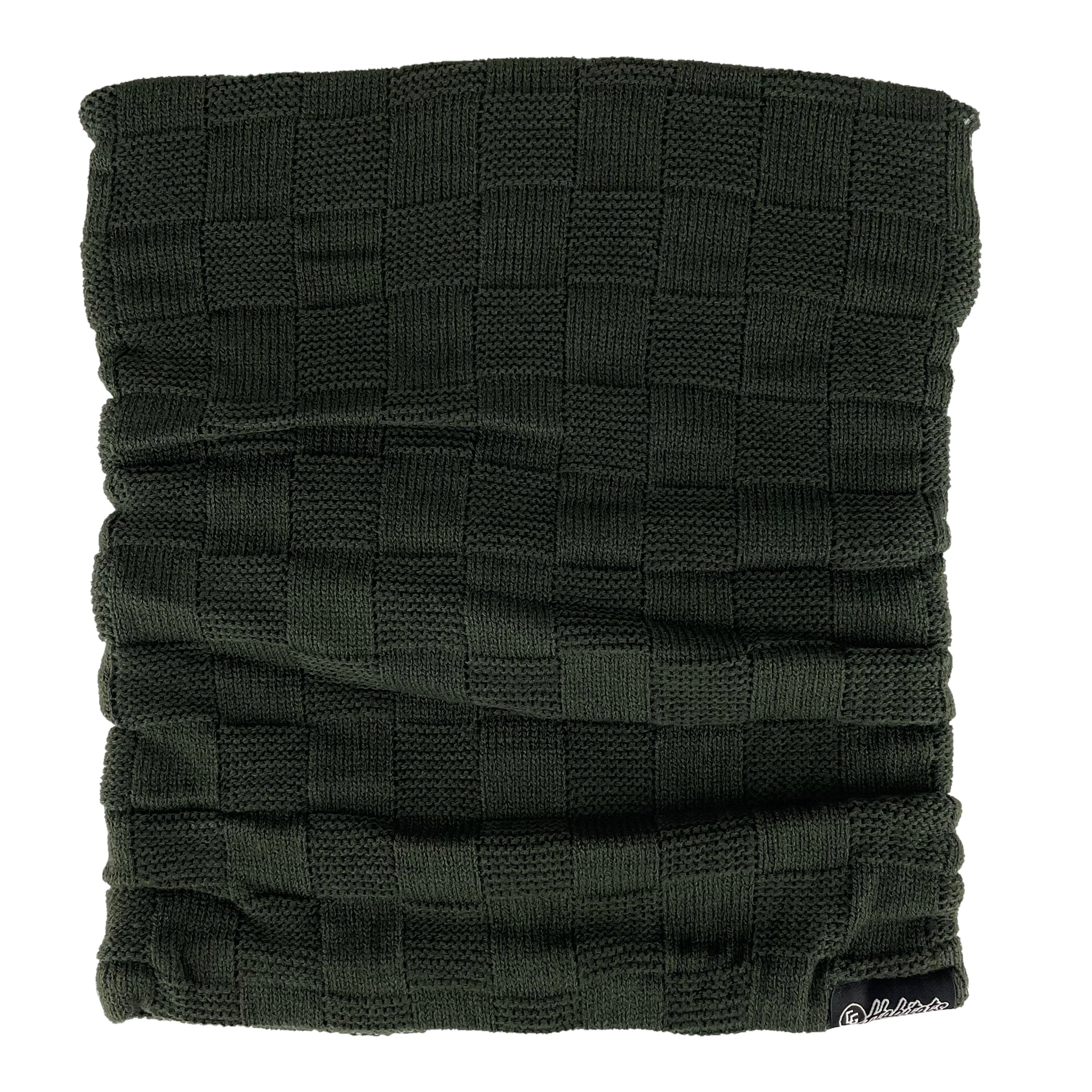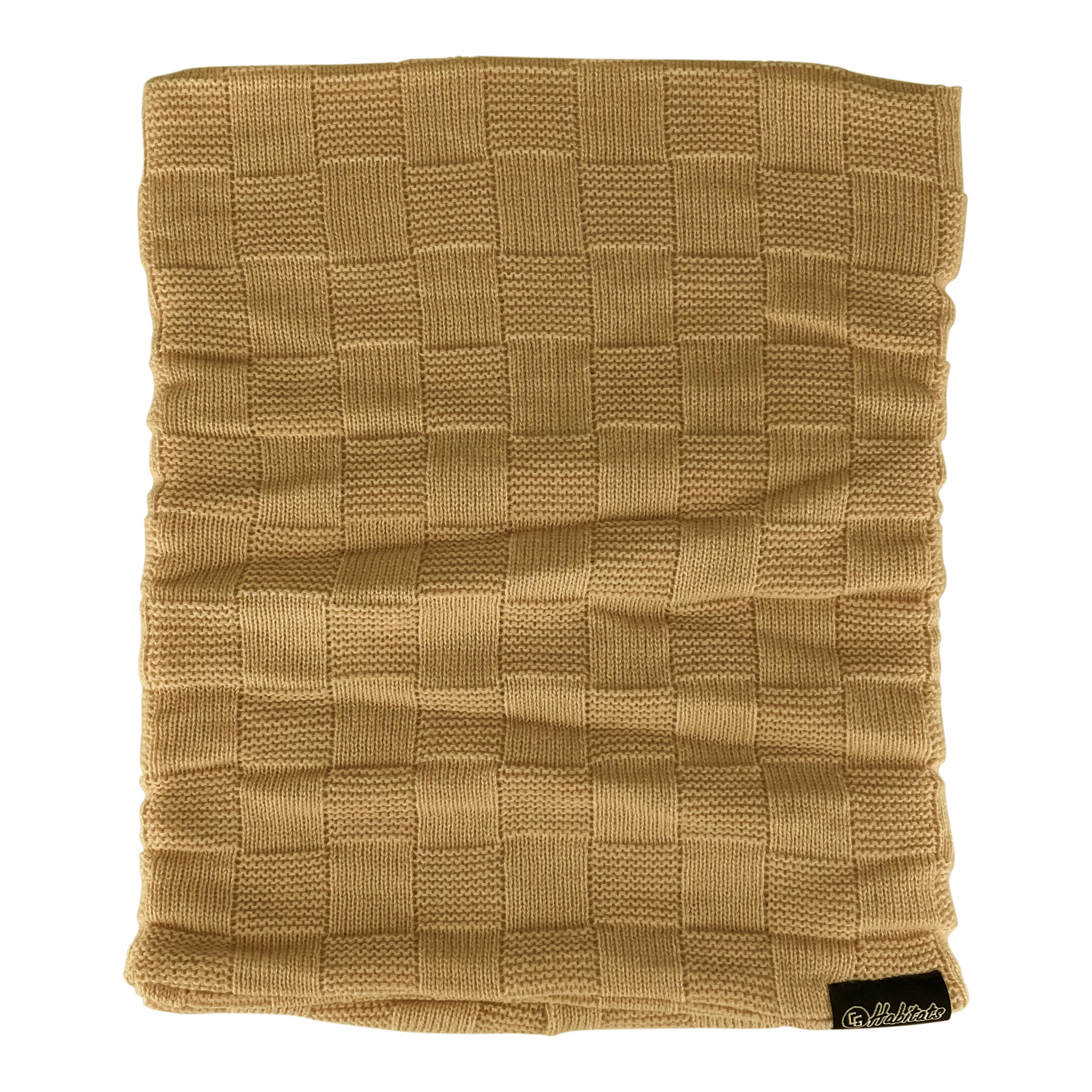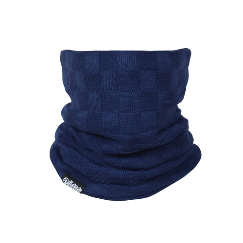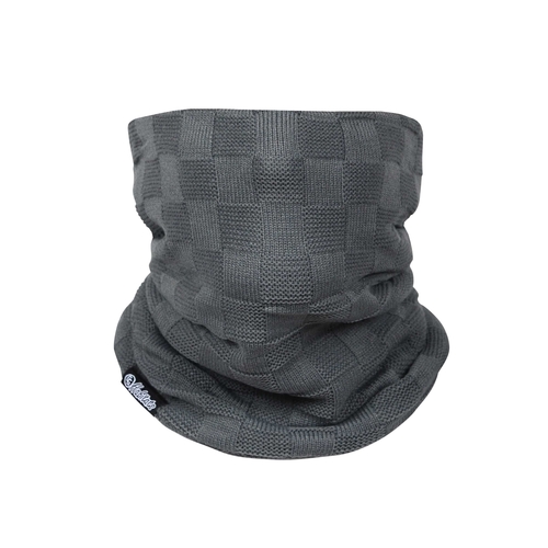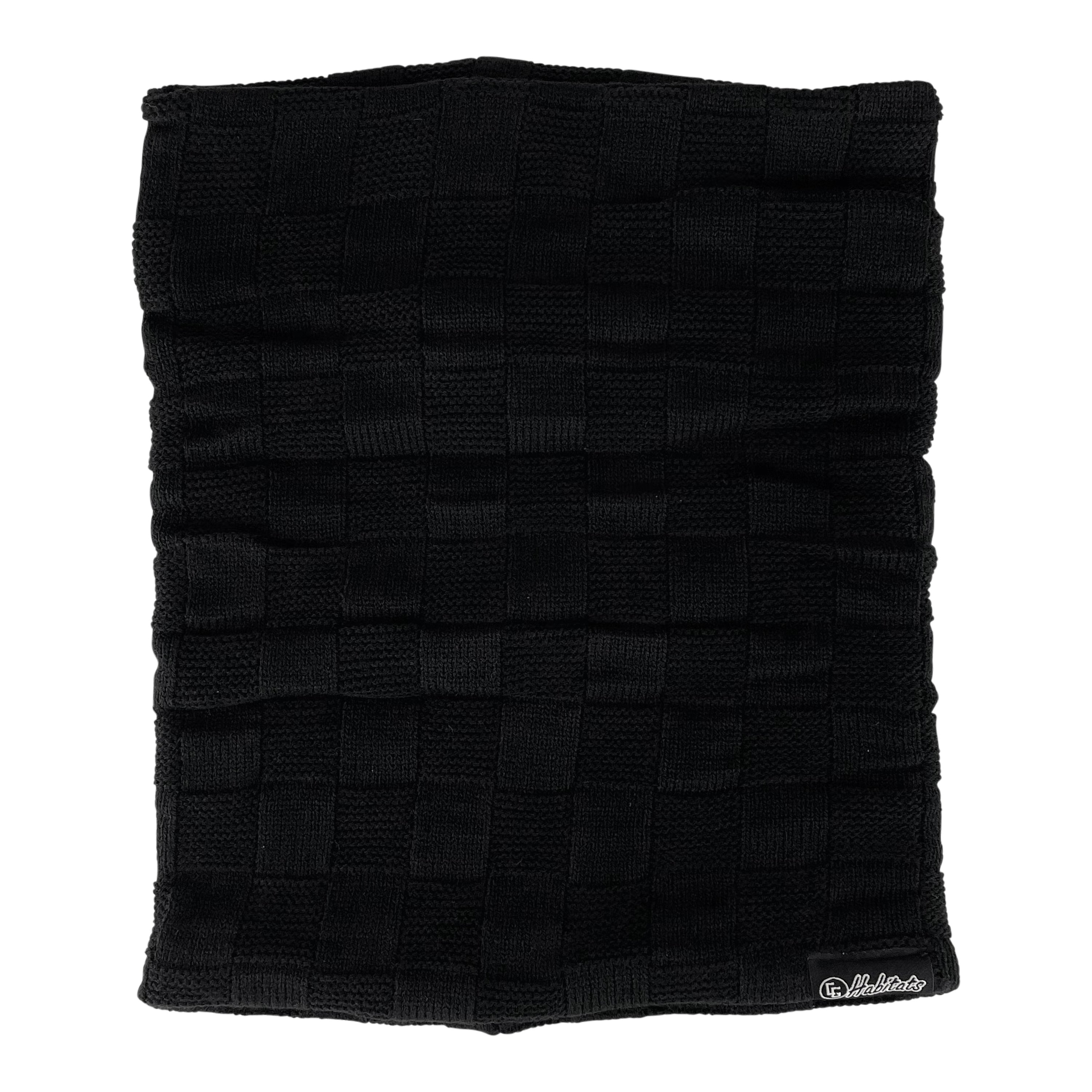 Knitted Neck Gaiter in stylish cube knit pattern, showcasing its double-layer construction and iron-on logo patch.