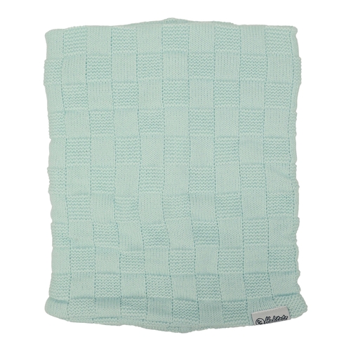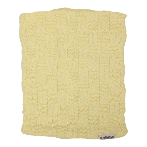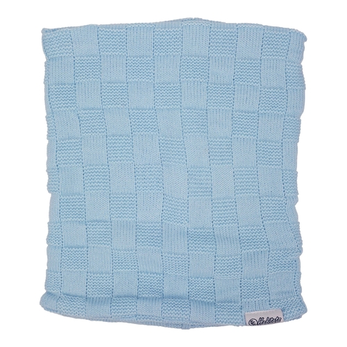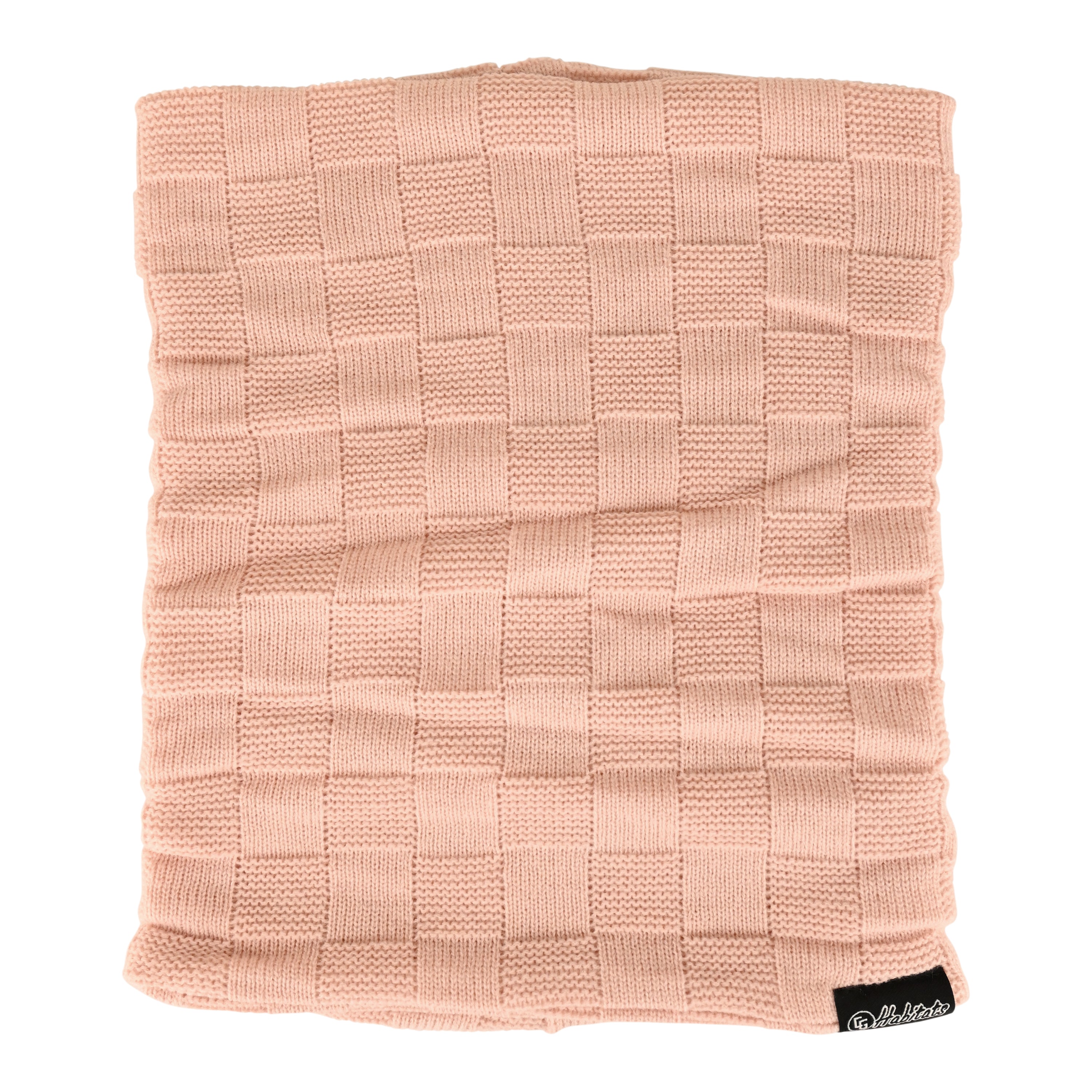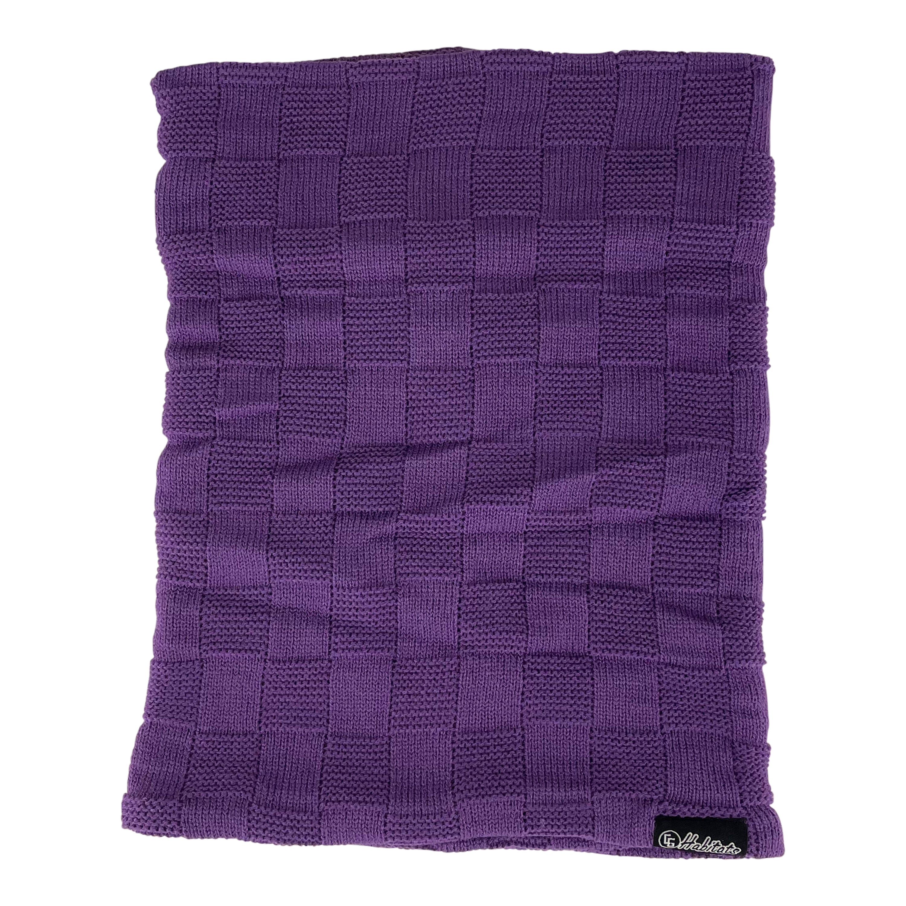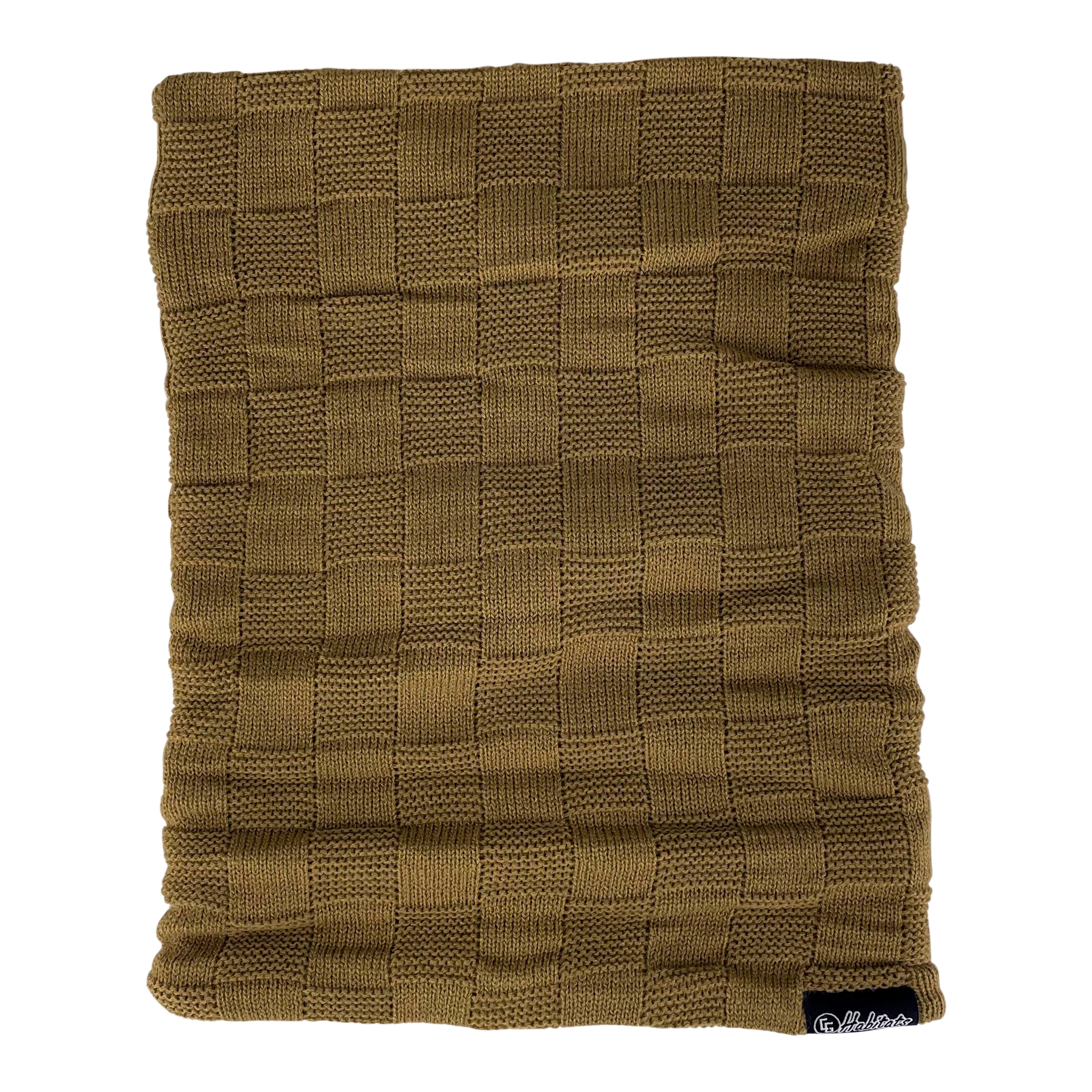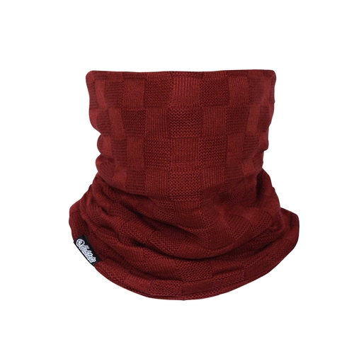 Knitted Neck Gaiter in stylish cube knit pattern, showcasing its double-layer construction and iron-on logo patch.