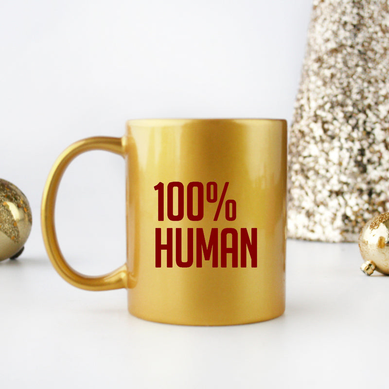 The 100% Human Gold & Silver Mug boasts a unique design that can be customized with either a one-sided or two-sided print. This versatility allows you to choose a style that best fits your personality or the occasion. The gold and silver accents add a touch of sophistication, making it an ideal choice for both casual and formal settings.