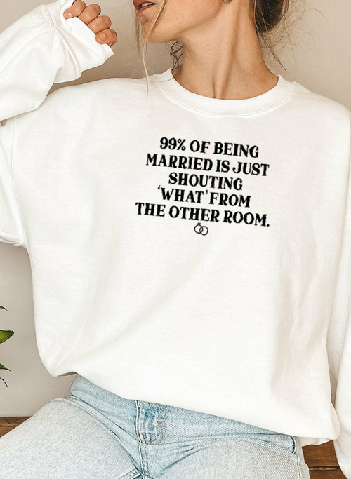 The 99% BEING MARRIED IS JUST SHOUTING Sweat Shirt is more than just a piece of clothing; it’s a way to express your sense of humor and personality. Whether you’re married, engaged, or just love the idea of marriage, this sweatshirt is a fun way to showcase your thoughts on relationships. It makes a great gift for friends or family members who appreciate a good laugh.