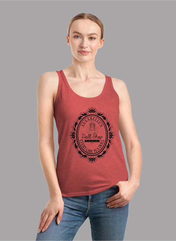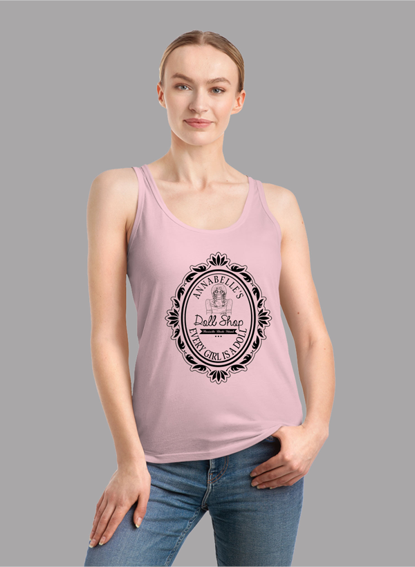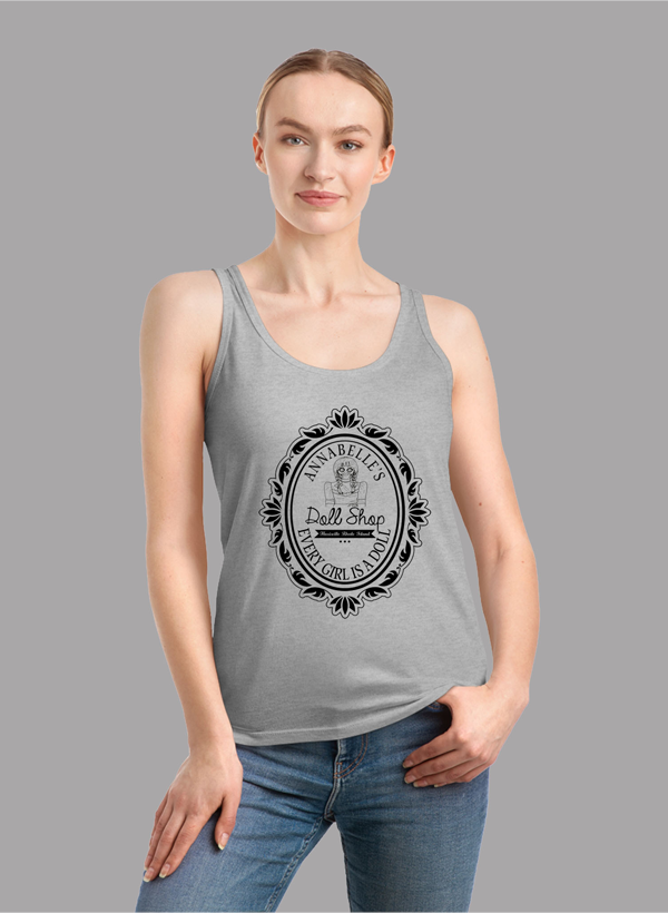 ANNABELLE'S Doll Shop Women Tank Top featuring a racer back style and curved hem, made from quick-drying fabric.