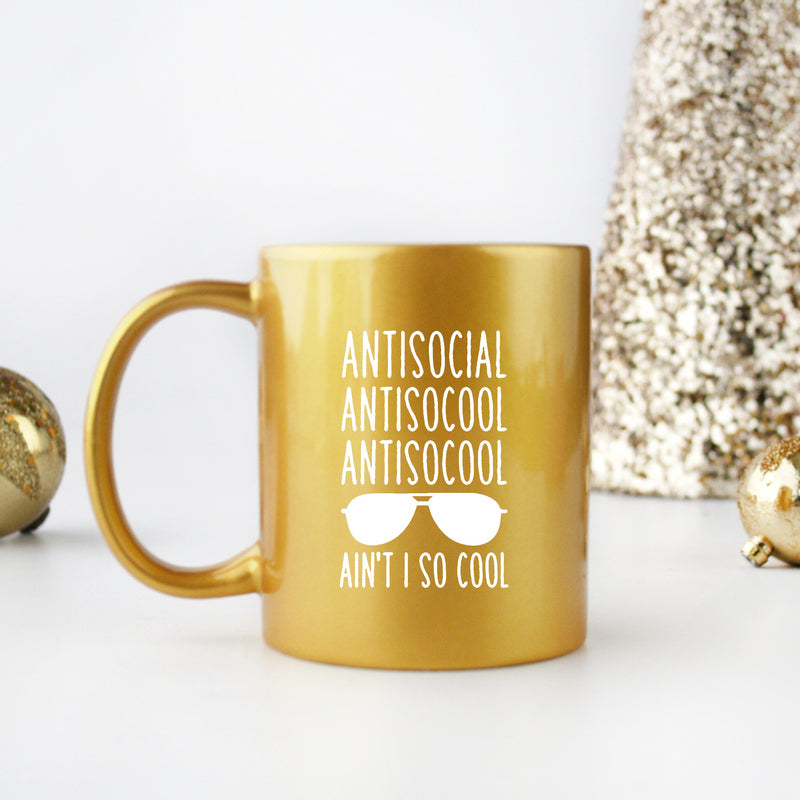 In summary, the Antisocial Aint So Cool Gold & Silver Mug is a stylish and functional addition to any drinkware collection. Its unique design, durable material, and perfect size make it a must-have for anyone who enjoys expressing their individuality through their belongings. Whether for personal use or as a gift, this mug is sure to delight and impress.