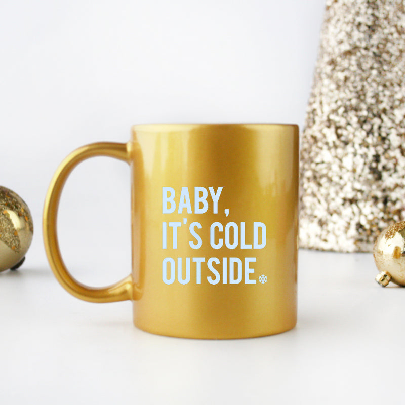 The Baby It's Cold Outside Mug showcases an elegant gold metallic coating that adds a touch of sophistication to your drinkware. The contrasting silver accents enhance its visual appeal, making it a standout piece in any kitchen or dining setting. Whether you're sipping hot cocoa, tea, or coffee, this mug is sure to impress your guests and elevate your drinking experience.