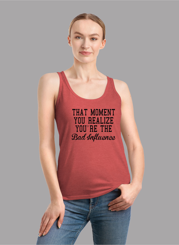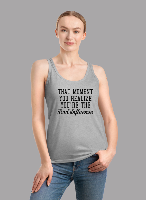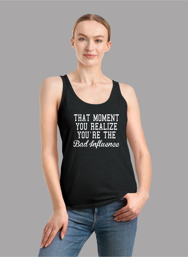 The Bad Influence Women Tank Top is available in a variety of colors to suit your personal style. Please note that the colors shown on the website are for illustrative purposes only and may differ from the actual product colors. We recommend using black and white images or black text for electric colors to ensure clarity.