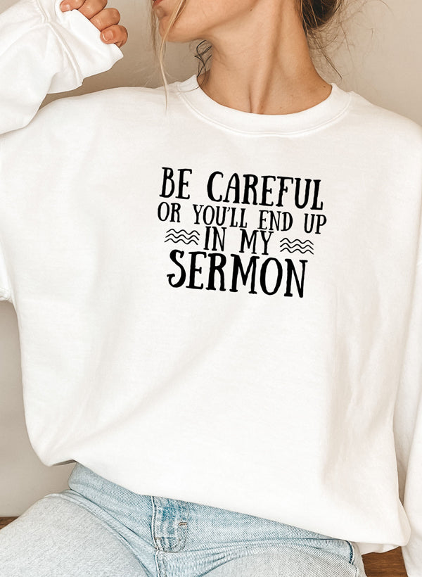 The Be Careful Or You'll End Up In My Sermon Sweat Shirt is incredibly versatile. Dress it up with a stylish jacket and accessories for a night out, or keep it casual with your favorite sneakers for a day of running errands. No matter how you choose to wear it, this sweatshirt is sure to become a favorite in your collection.