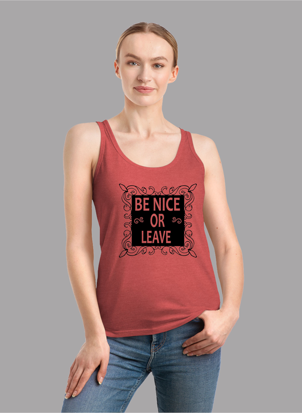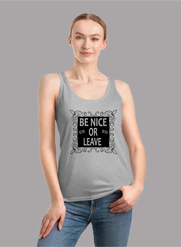 The Be Nice Or Leave Tank Top is available in various colors, allowing you to express your personal style. Please note that the colors shown on the website are for illustrative purposes only and may differ from actual product colors. For the best results, we recommend using black and white images or black text for electric colors.
