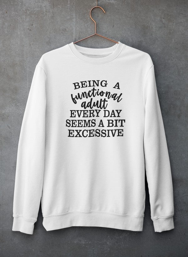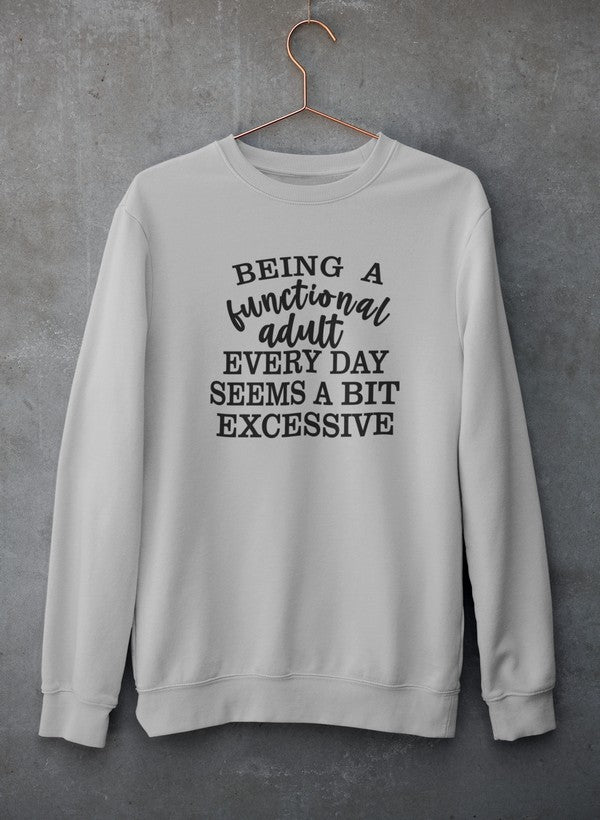 The 'Being a Functional Adult Every Day Seems a Bit Excessive' sweatshirt is perfect for casual outings or cozy nights in. Pair it with your favorite jeans for a laid-back look or wear it over leggings for a comfortable outfit. Its humorous slogan adds a playful touch to your ensemble, making it a great conversation starter.