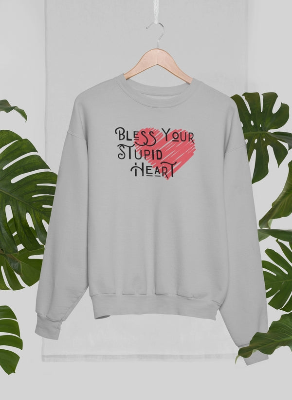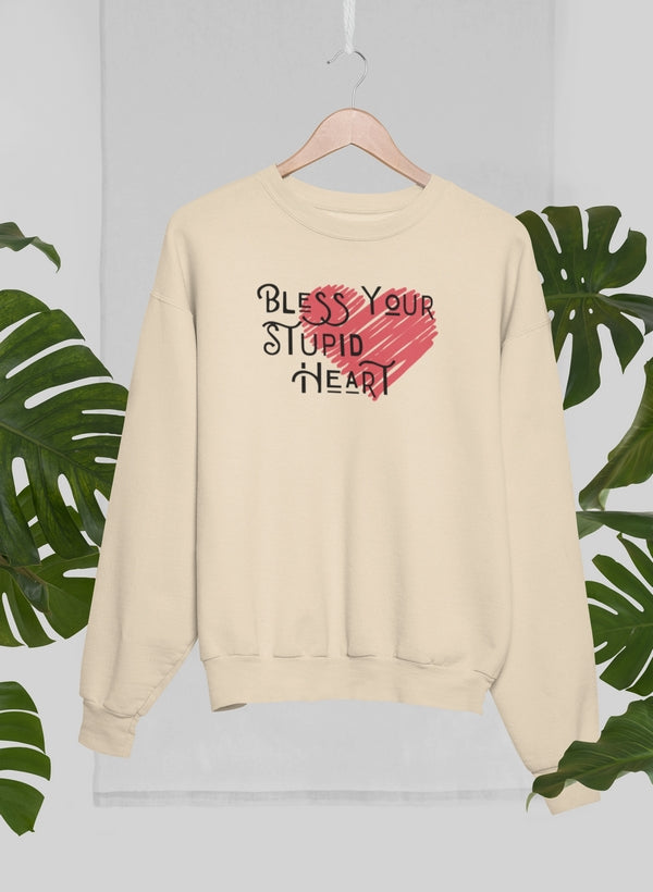 A cozy Bless Your Stupid Heart Sweat Shirt featuring a unique design, made from a soft cotton/poly fleece blend, perfect for casual wear.
