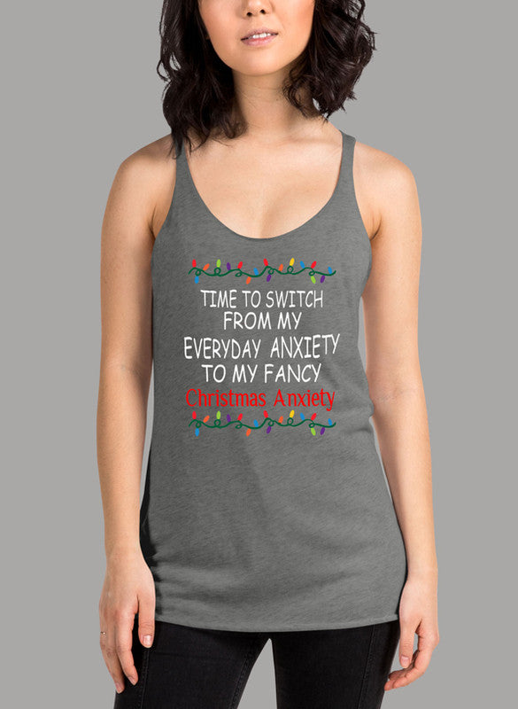 A stylish Christmas Anxiety Women Tank Top featuring a racer back design and curved hem, made from quick-drying Neoteric™ fabric.