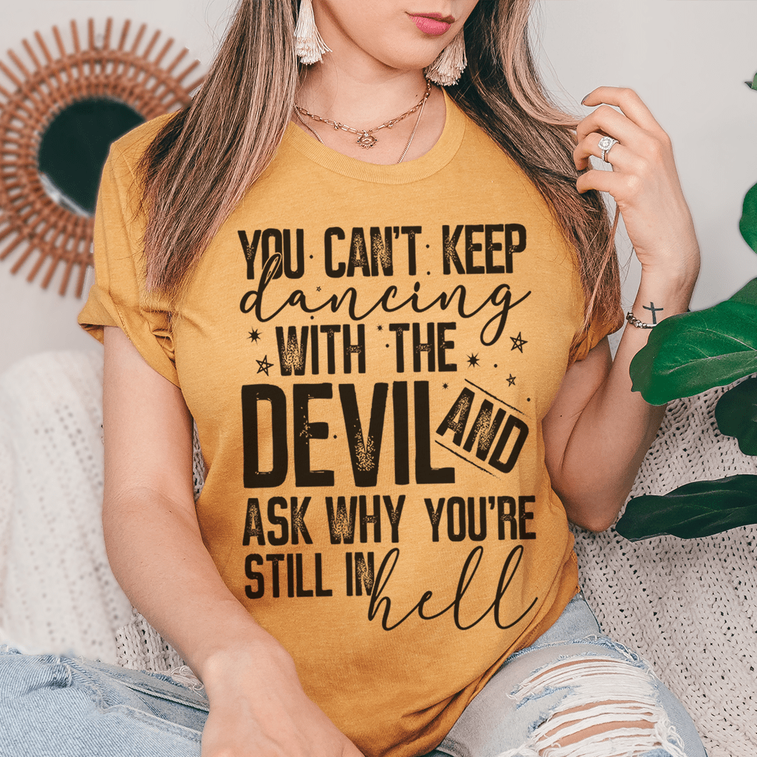 Introducing the Dancing With The Devil T-Shirt, the ultimate staple for your wardrobe. Crafted from 100% soft ring-spun cotton, this t-shirt promises not only comfort but also durability. The heavier cotton fabric feels luxurious against your skin, while the double stitching on the neckline and sleeves ensures that this shirt will withstand the test of time. Whether you're dressing up for a casual outing or lounging at home, this t-shirt is designed to be your go-to choice.