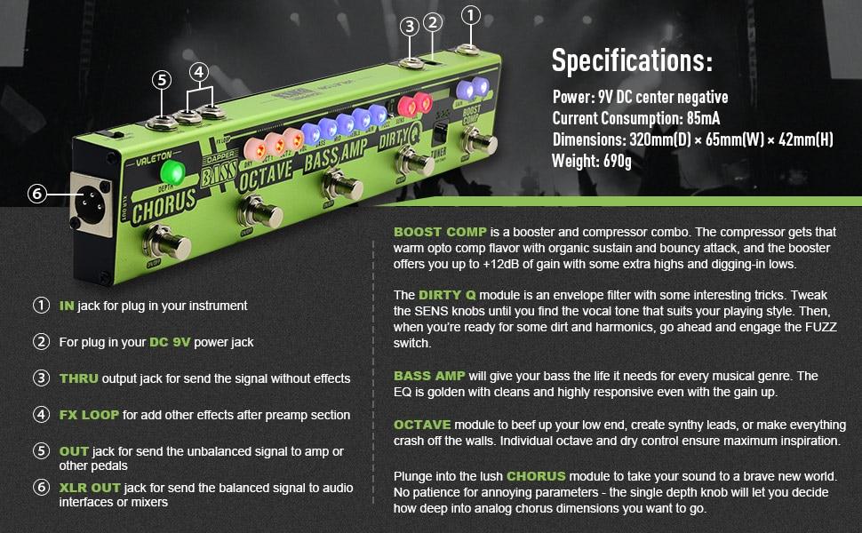 This pedal includes a variety of effects that are crucial for bass players. The built-in tuner ensures that your instrument is always in perfect pitch, while the chorus effect adds depth and richness to your sound. The octaver allows you to create lower harmonics, giving your bass lines a fuller tone. Additionally, the Dirty Q effect provides a unique distortion that can add character to your playing, and the boost compressor helps to enhance your overall sound without losing clarity.