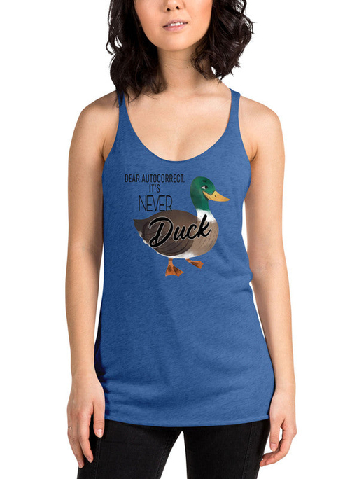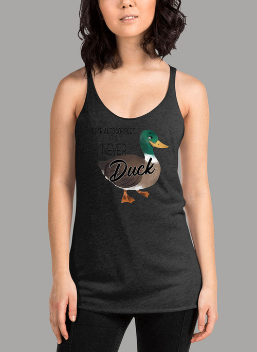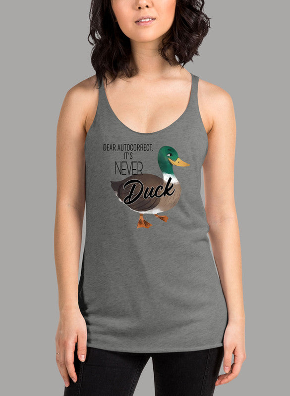 Dear Autocorrect It's Never Duck Women Tank Top in a stylish racer back design, showcasing its curved back hem and vibrant color.