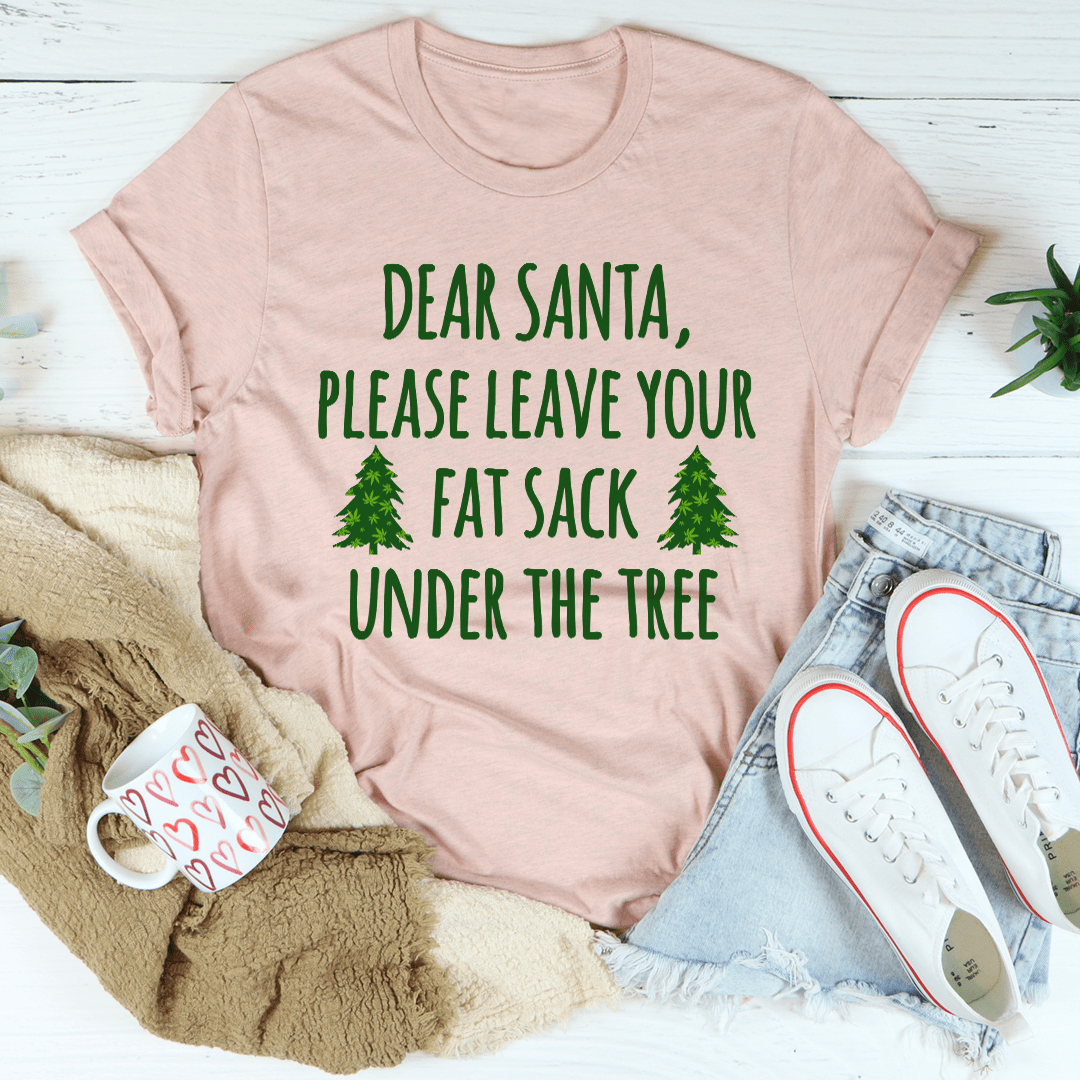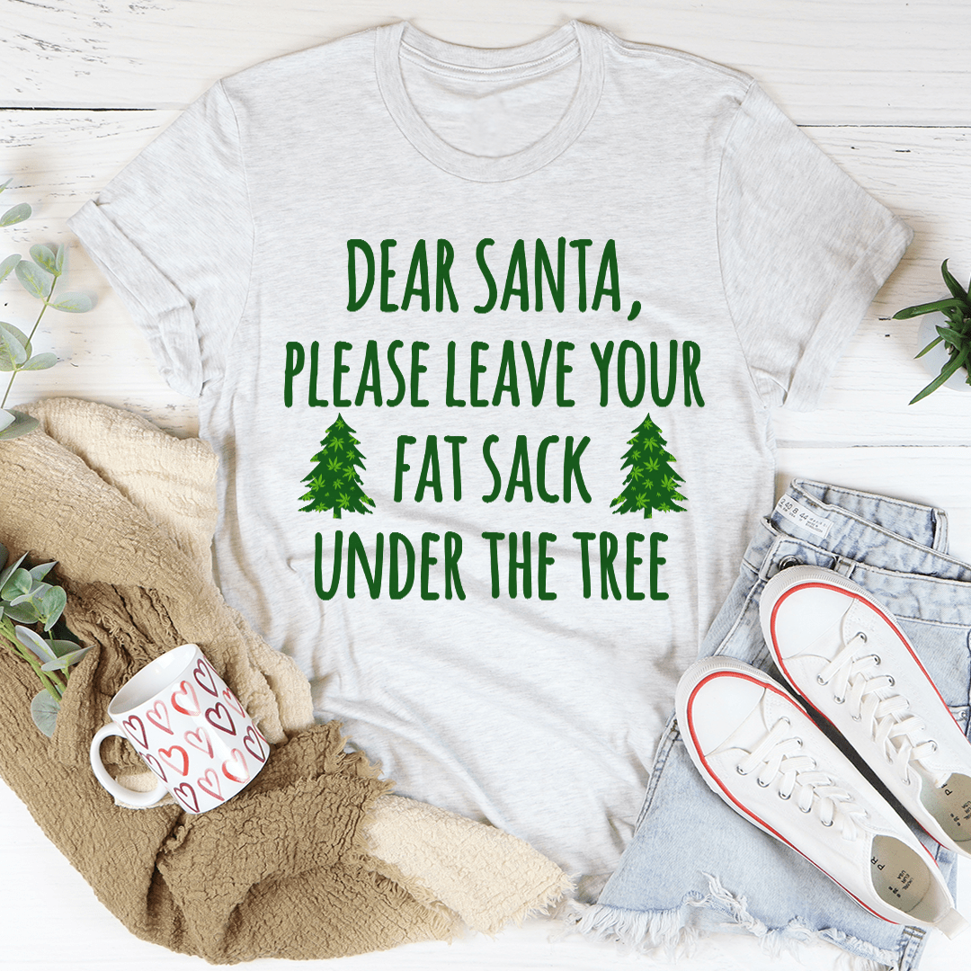 Introducing the 'Dear Santa Leave Your Fat Sack Under The Tree Tee', the perfect addition to your holiday wardrobe. This t-shirt is not just a piece of clothing; it's a statement that captures the festive spirit of the season. Made from 100% soft ring-spun cotton, this tee promises comfort and durability, making it an ideal choice for holiday gatherings, parties, or simply lounging at home.
