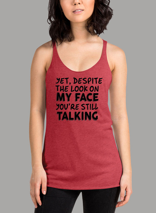 Whether you're hitting the gym, running errands, or just relaxing at home, the 'Despite The Look On My Face You're Still Talking' Women Tank Top is the perfect choice. With its stylish design, comfortable fit, and responsible production, this tank top is sure to become a favorite in your collection.