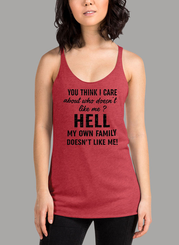 Do You Think I Care Women Tank Top featuring a racerback design and curved back hem in a stylish fit.