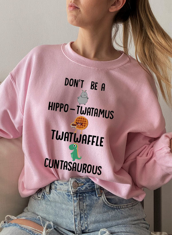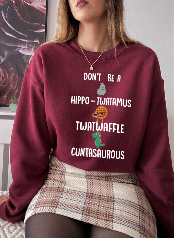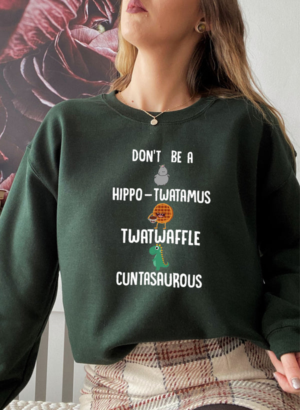 Introducing the Don't Be A Hippo Twatamus Twatwaffle Cuntasaurous Sweat Shirt, a unique and humorous addition to your wardrobe that allows you to express your individuality. This sweatshirt is not just a piece of clothing; it’s a statement. Made from a cozy cotton and polyester fleece blend, it offers warmth and comfort, making it perfect for any casual occasion.