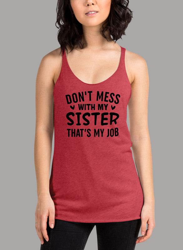 In summary, the 'Don't Mess With My Sister That's My Job' Black Women Tank Top is a stylish, comfortable, and functional piece that every active woman should have in her wardrobe. With its high-quality fabric, sun protection, and ethical production, this tank top is not only a fashion statement but also a responsible choice.