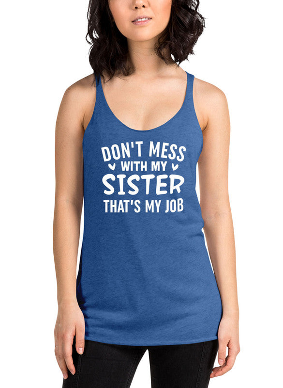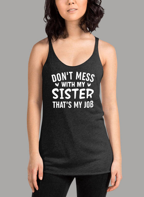 Introducing the 'Dont Mess With My Sister That's My Job' White Women Tank Top, a perfect blend of style and functionality for the modern woman. This performance tank top is designed to make a statement while providing comfort and support during your active lifestyle. Whether you're hitting the gym, going for a run, or just lounging at home, this tank top is an ideal choice.