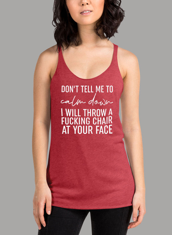 To ensure the perfect fit, please refer to our size guide. The Dont Tell Me To Calm Down White Women Tank Top is available in a range of sizes from XS to 2XL. Here are the measurements: