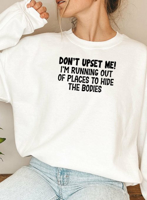 The 'Don't Upset Me I'm Running Out Of Places To Hide The Bodies' sweatshirt is not just a piece of clothing; it's a statement. Its unique design allows you to express your personality and sense of humor. Pair it with jeans for a casual look or layer it over a dress for a trendy outfit. This sweatshirt is versatile enough to fit into any wardrobe, making it a must-have for anyone who loves to stand out.