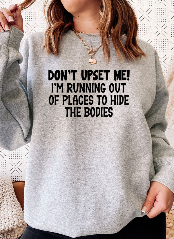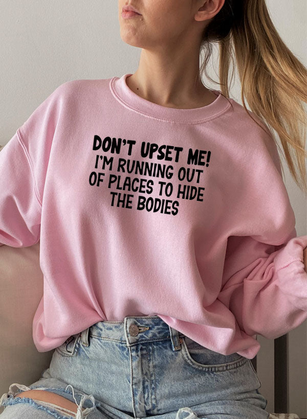 A cozy sweatshirt featuring the humorous phrase 'Don't Upset Me I'm Running Out Of Places To Hide The Bodies', made from soft cotton/poly fleece blend.