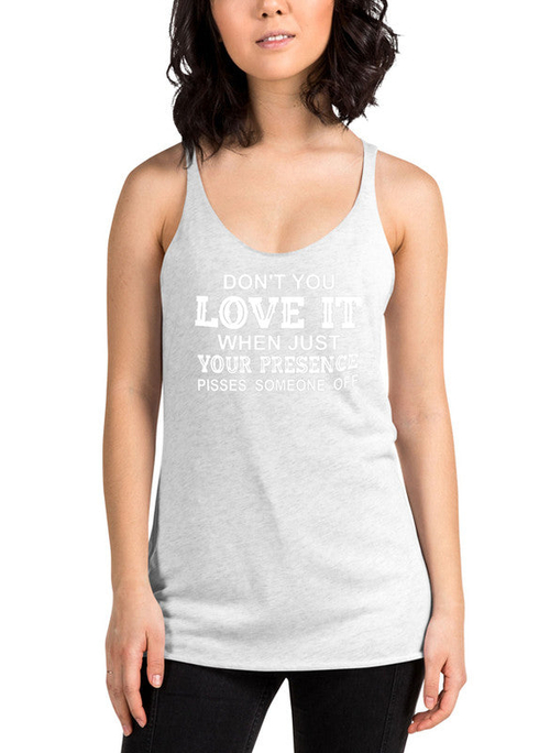 Introducing the 'Dont You Love It When Just Your Presence Pisses Someone Off' Women Performance Tank Top, a perfect blend of style and functionality. This tank top is designed for women who want to make a statement while enjoying the comfort of high-performance fabric. Whether you're hitting the gym, going for a run, or just lounging around, this tank top is an ideal choice.