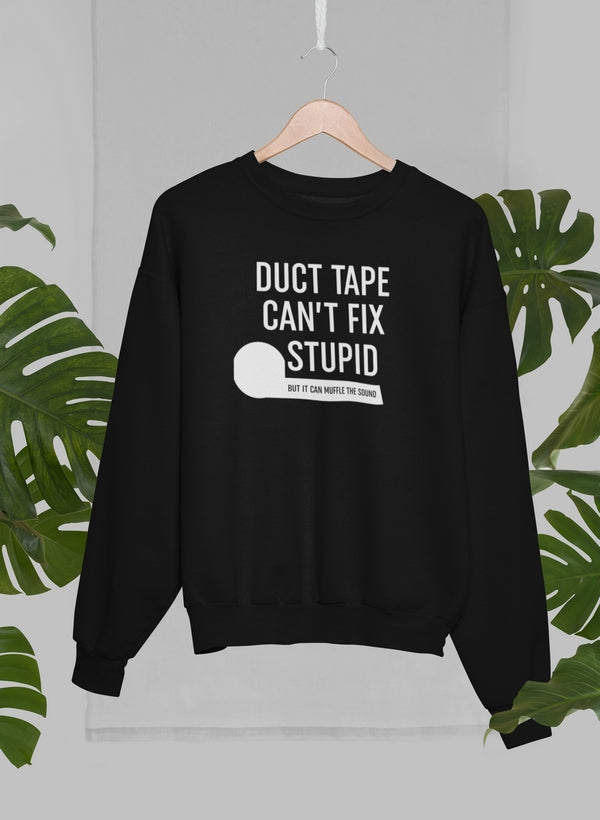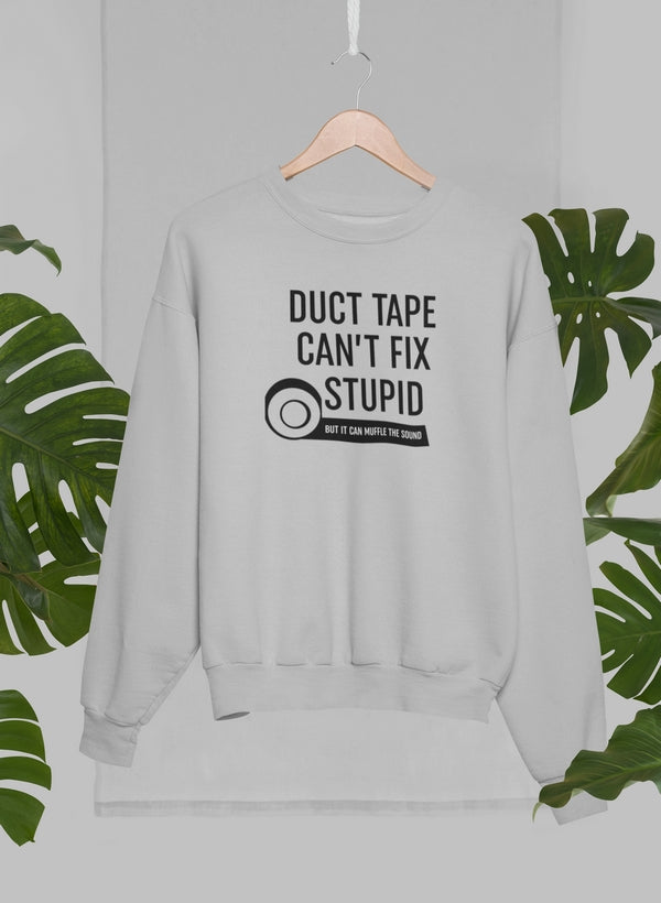 In summary, the Duct Tape Can't Fix Stupid Sweat Shirt is more than just a piece of clothing; it's a statement. With its unique design, comfortable fit, and ethical manufacturing, it's a choice you can feel good about. Add this stylish sweatshirt to your collection today and express yourself in a fun and fashionable way!