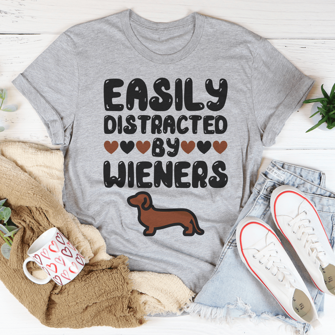 This tee is perfect for a variety of occasions. Pair it with jeans for a casual day out, or wear it with shorts for a relaxed summer look. Its playful design makes it a great conversation starter, and it's sure to bring a smile to anyone who sees it. The Easily Distracted By Wieners Tee is not just a t-shirt; it's a fun way to express your love for humor and good times.