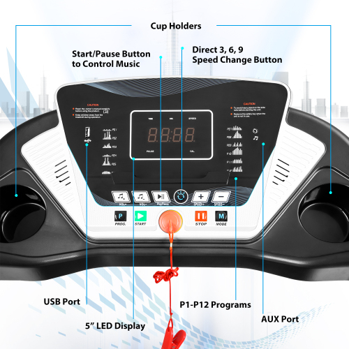 【MP3 and Audio Auxiliary Port & Speed direct selection button】Stay motivated during your workout by listening to your favorite playlist while running through the built-in dual speakers; When the treadmill is on, you could press 3, 6, 9 buttons to change the speed directly.
