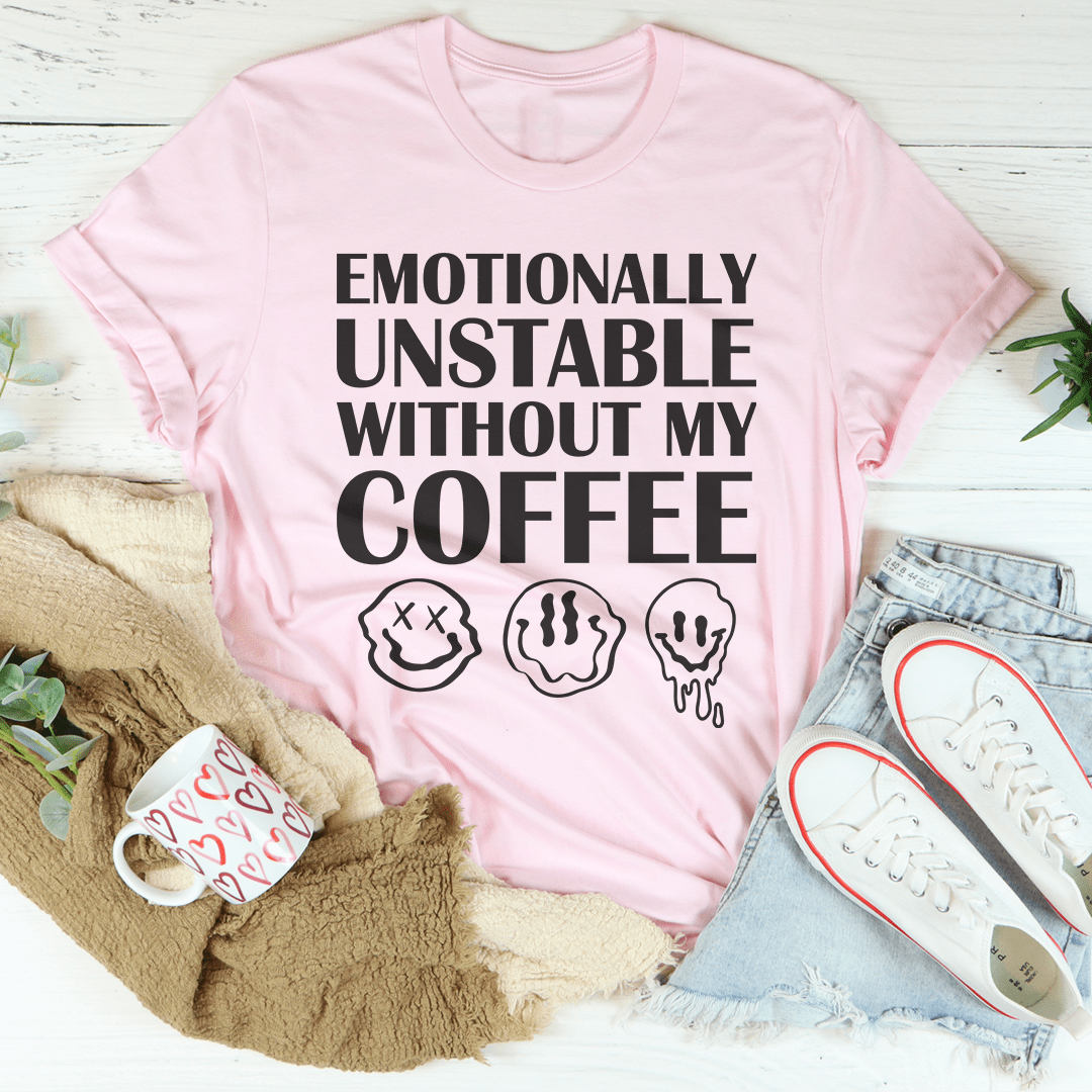 Emotionally Unstable Without My Coffee T-Shirt in soft cotton, featuring double stitching and a playful coffee-themed design.