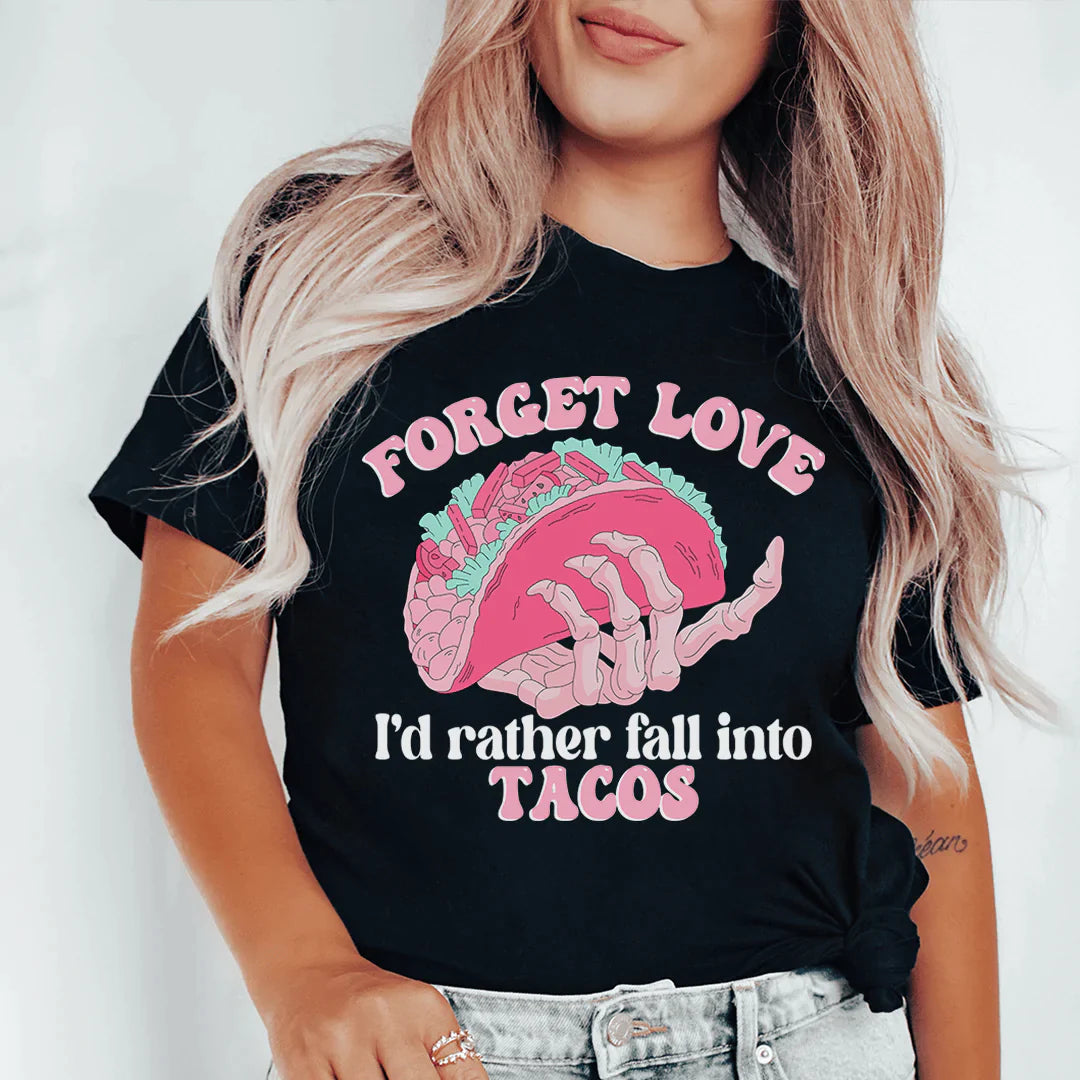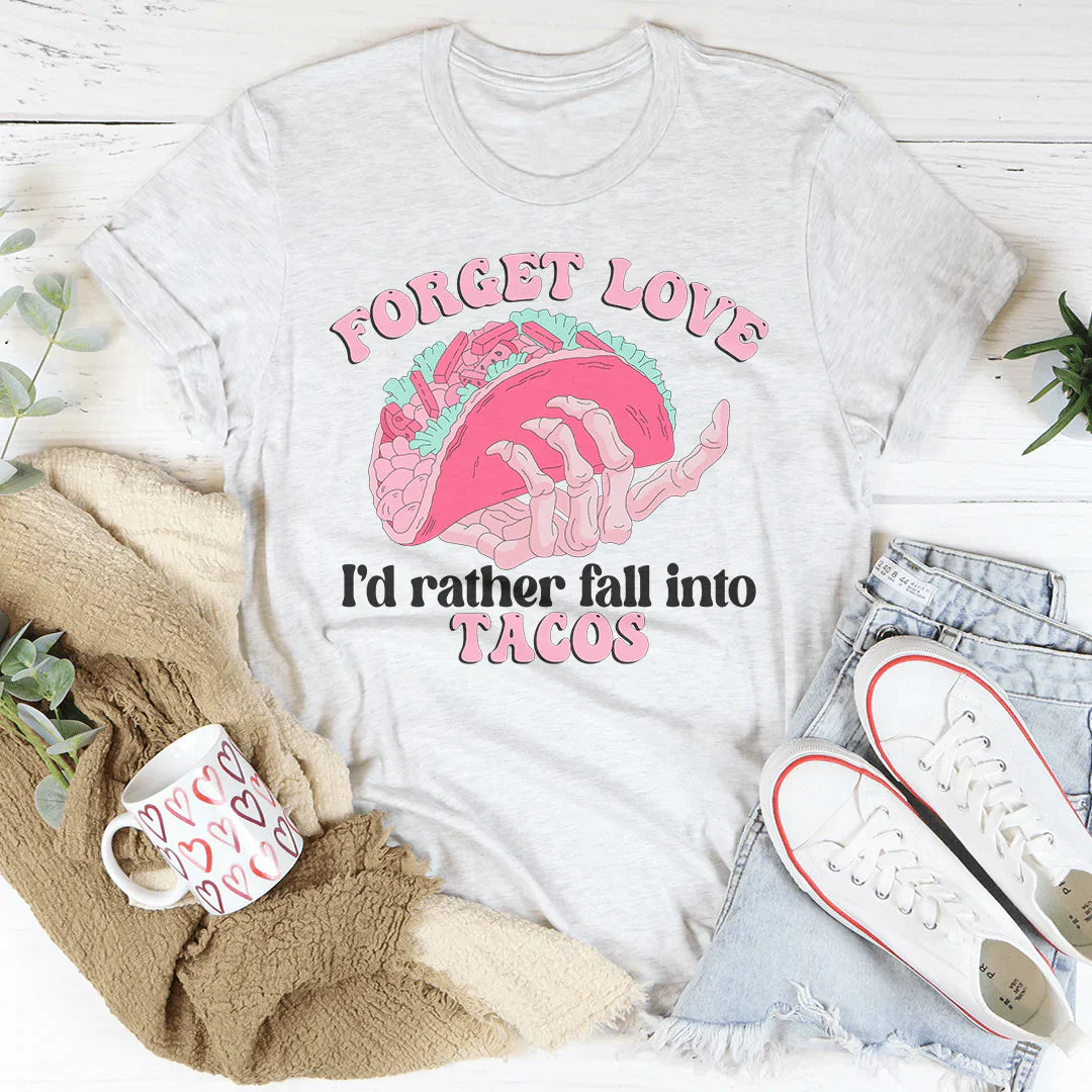 The playful slogan 'Forget Love I'd Rather Fall Into Tacos' adds a fun twist to your casual attire. It's a great conversation starter and a way to express your love for tacos in a light-hearted manner. Whether you're at a taco truck, a casual gathering, or just hanging out with friends, this tee is sure to bring smiles and laughter.