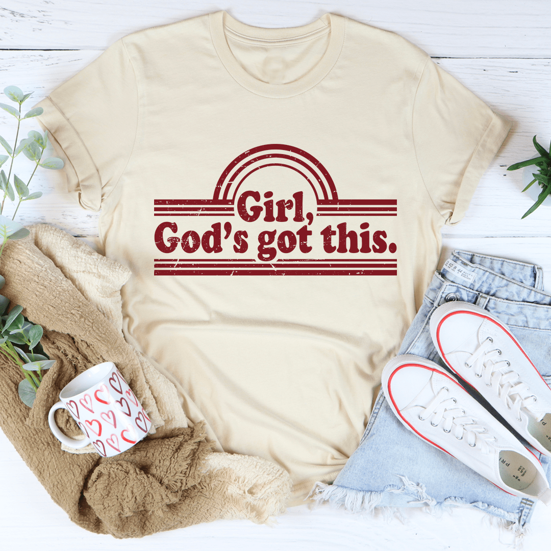 This t-shirt is not just about comfort; it also boasts a stylish design that can be dressed up or down. Pair it with your favorite jeans for a casual look or layer it under a blazer for a more polished outfit. The Girl God's Got This Tee is versatile enough to be worn on various occasions, making it a must-have addition to your wardrobe.