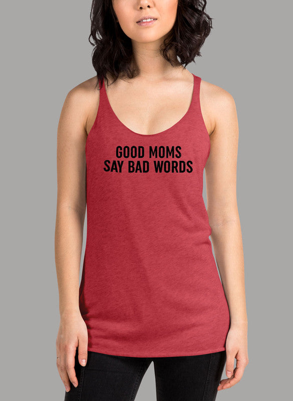 Black women's tank top featuring the phrase 'Good Moms Say Bad Words' with a racer back design and curved hem.