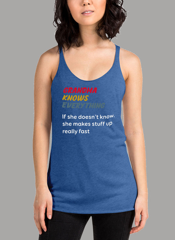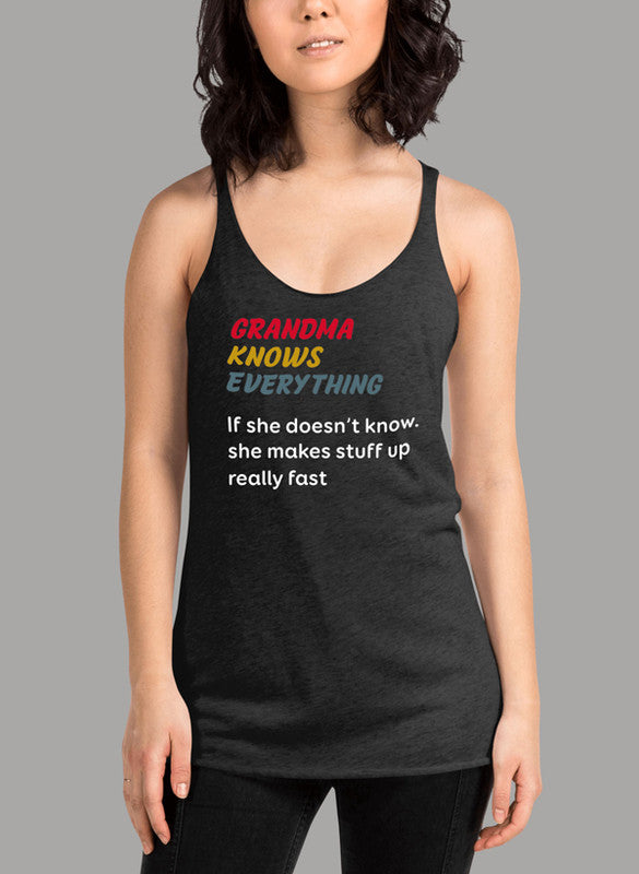 A stylish Grandma Knows Everything Women's Tank Top featuring a racer back design and curved hem, made from quick-drying fabric.