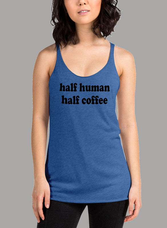 The racer back style of the Half Human Half Coffee tank top not only adds a trendy touch but also allows for a full range of motion. The curved back hem enhances comfort and style, making it suitable for both athletic and casual wear. Pair it with your favorite leggings or shorts for a complete look that transitions seamlessly from workout to everyday wear.
