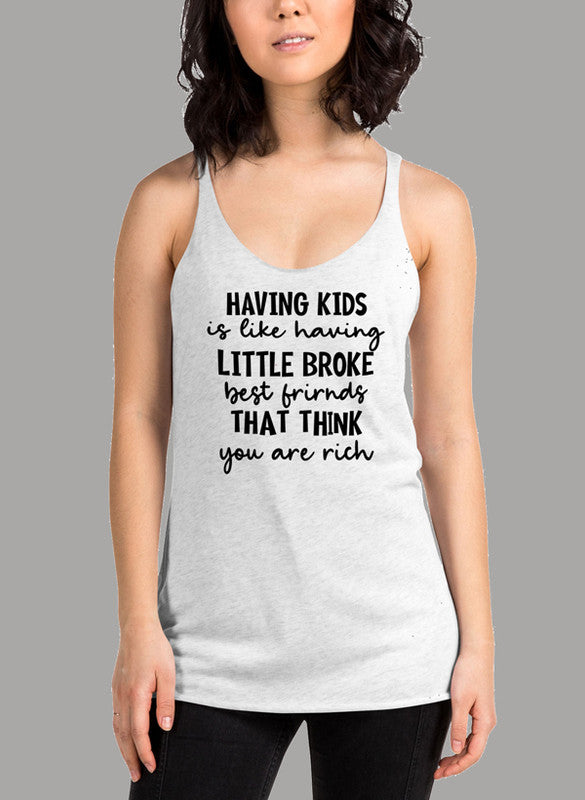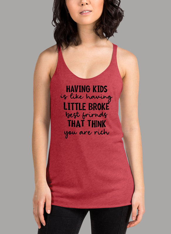 In summary, the 'Having Kids Is Like Having Little Broke Friends' Black Women's Tank Top is a must-have for any active woman looking to combine style, comfort, and a touch of humor. With its high-quality fabric, ethical production, and flattering design, this tank top is sure to become a favorite in your wardrobe.