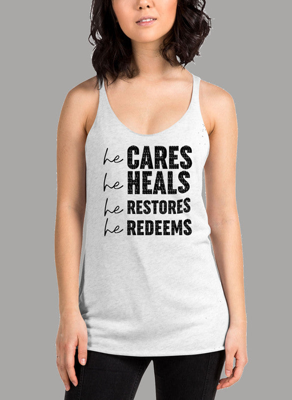 In summary, the He Cares He Heals He Restores He Redeems Black Women's Tank Top is an essential addition to any active woman's wardrobe. With its stylish design, high-performance fabric, and ethical production, this tank top is perfect for workouts, casual outings, or simply lounging at home. Experience the perfect combination of comfort and style with this versatile tank top.