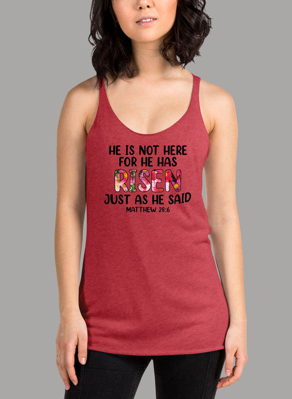 In summary, the He Is Not Here For He Has Risen Black Women's Tank Top is a versatile addition to any wardrobe. With its stylish design, high-quality fabric, and ethical production, it’s a tank top you can feel good about wearing. Whether you’re working out, running errands, or enjoying a day out, this tank top is sure to become a favorite in your collection.