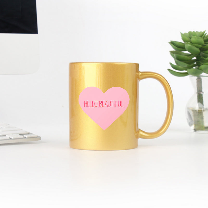 Crafted from high-quality ceramic, the Hello Beautiful Heart Mug is designed to withstand daily use while maintaining its stunning appearance. The gold metallic coating enhances its aesthetic appeal, giving it a luxurious feel. However, it's important to note that this mug is not dishwasher or microwave safe, so hand washing is recommended to preserve its beauty and integrity.