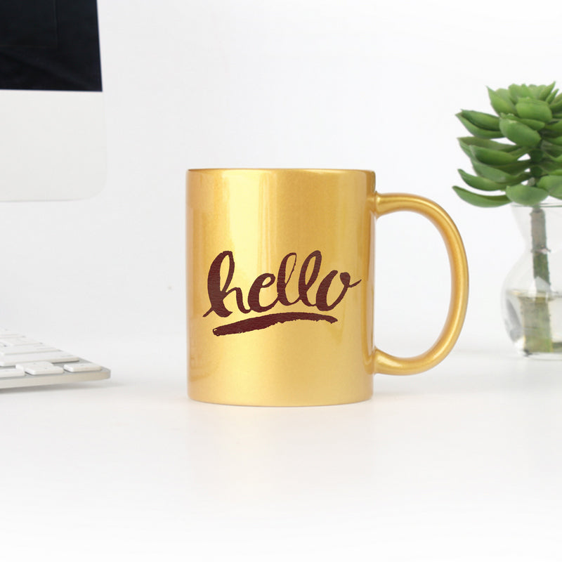 The Hello Hand Lettering Gold & Silver Mug features a unique one or two-sided design, allowing you to choose how you want to showcase its beauty. The gold metallic coating adds a luxurious touch, making it an ideal gift for special occasions or a treat for yourself. Whether you're enjoying your morning coffee or sipping tea in the afternoon, this mug is sure to impress.
