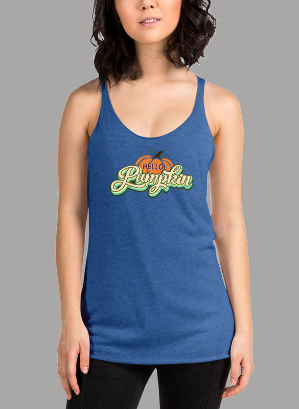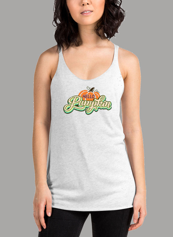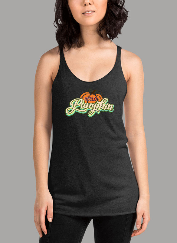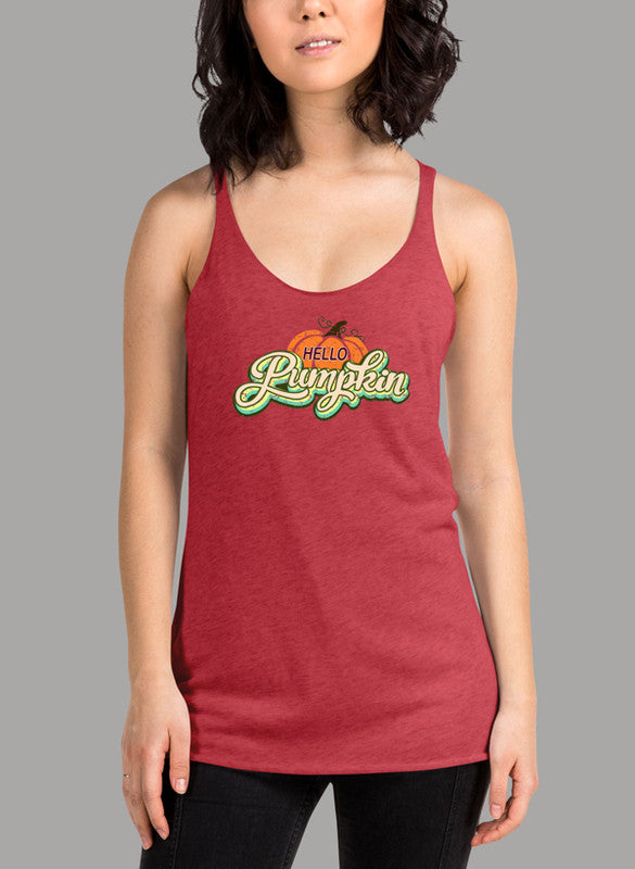 Hello Pumpkin Women's Tank Top featuring a racer back style and curved back hem in a vibrant color.