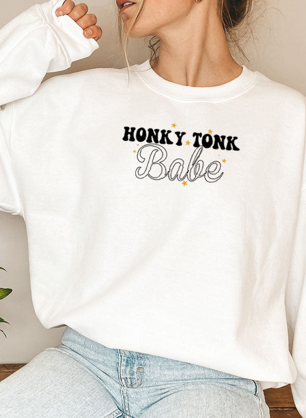 The Honky Tonk Babe Sweat Shirt is incredibly versatile and can be styled in numerous ways. Pair it with your favorite jeans for a casual look, or layer it over a dress for a trendy outfit. Add some accessories like a statement necklace or a beanie to elevate your style. This sweatshirt is perfect for any occasion, whether you're running errands, meeting friends, or just relaxing at home.