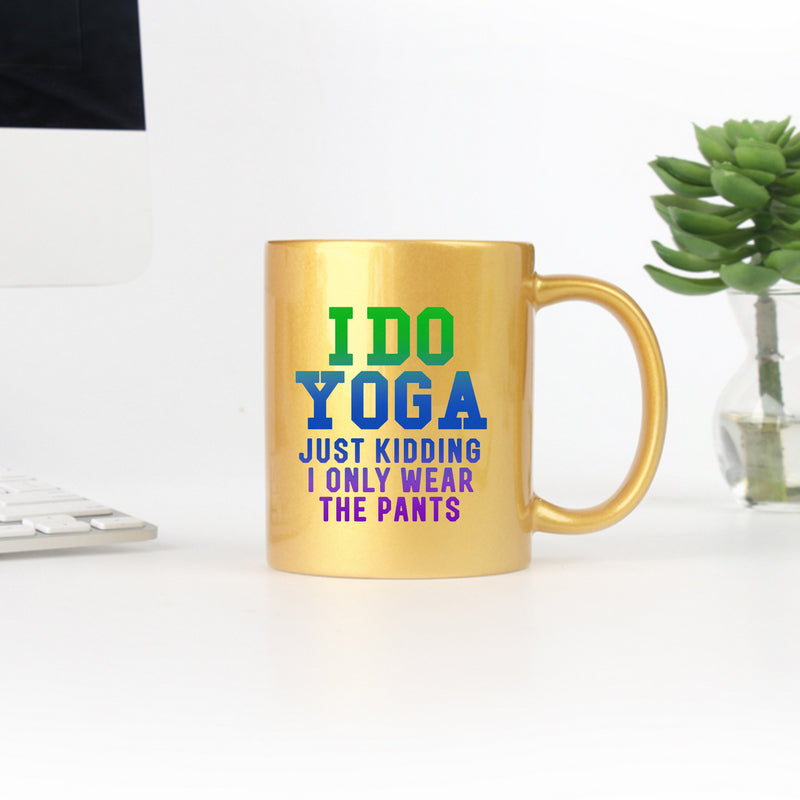 The mug features a delightful one or two-sided design that showcases the playful phrase, 'I Do Yoga Just Kidding I Only Wear The Pants.' This witty statement is perfect for anyone who enjoys yoga culture but prefers the comfort of lounge wear. The gold metallic coating adds a touch of elegance, making it a stylish addition to your kitchen or office.