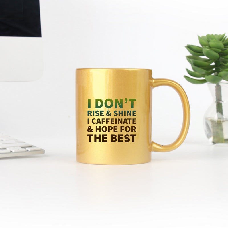 In summary, the 'I Don't Rise And Shine I Caffeinate And Hope For The Best' mug is a must-have for anyone who enjoys their coffee with a side of humor. Its elegant design, quality materials, and perfect size make it a versatile addition to your drinkware collection. Don't miss out on the chance to own this delightful mug or gift it to someone special!
