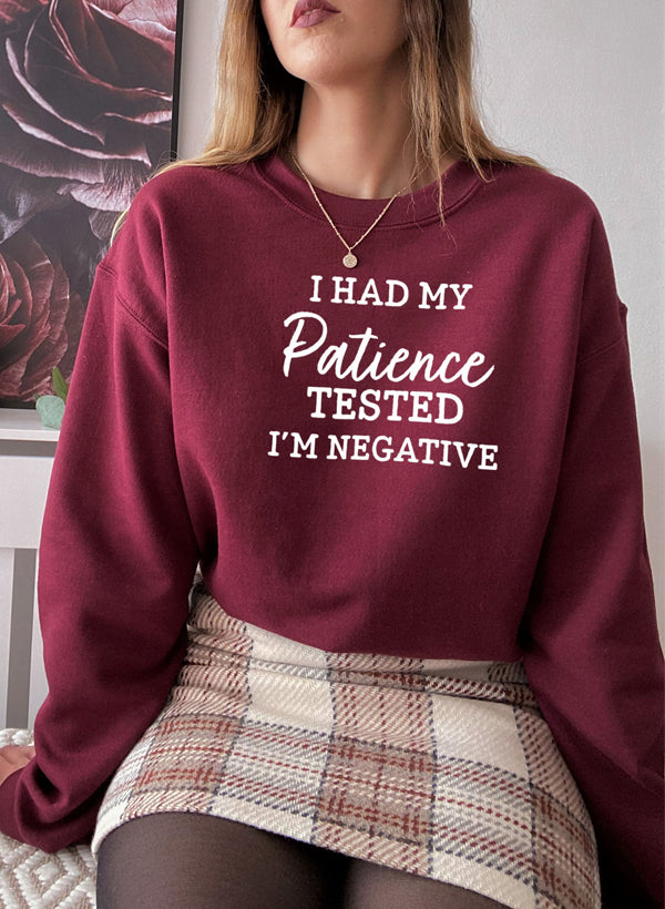 In summary, the I Had My Patience Tested I'm Negative Sweat Shirt is a must-have for anyone looking to combine comfort, style, and ethical fashion. With its unique design, high-quality materials, and perfect fit, it is sure to become one of your favorite pieces. Don't miss out on the opportunity to express yourself with this stylish sweatshirt!