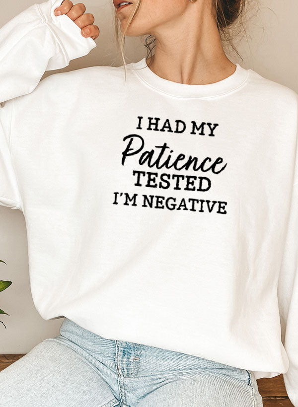The I Had My Patience Tested I'm Negative Sweat Shirt is more than just a piece of clothing; it's a statement. With its unique design, it allows you to express your personality and sense of humor. Whether you're wearing it to a casual gathering or just lounging at home, this sweatshirt is sure to turn heads and spark conversations.