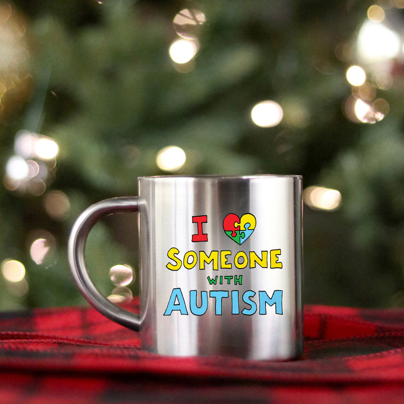 Ceramic mug with gold and silver design stating 'I Love Someone With Autism', perfect for coffee or tea.