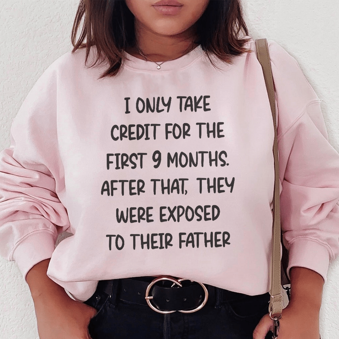 The 'I Only Take Credit For The First 9 Months' sweats are incredibly versatile. Pair them with your favorite jeans for a casual look, or wear them with joggers for a sporty vibe. They can easily transition from day to night, making them a staple in your wardrobe. The unique design adds a touch of personality to any outfit, allowing you to showcase your style effortlessly.