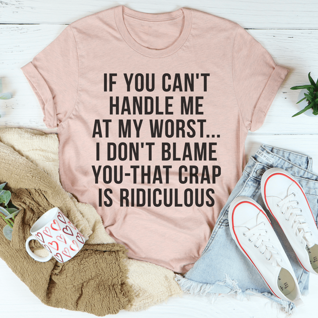 To keep your If You Can't Handle Me At My Worst Tee looking its best, it’s important to follow the care instructions. Machine wash cold with like colors, and tumble dry low to maintain the fabric's softness and prevent any shrinkage. Avoid using bleach to preserve the vibrant print and color of the tee.